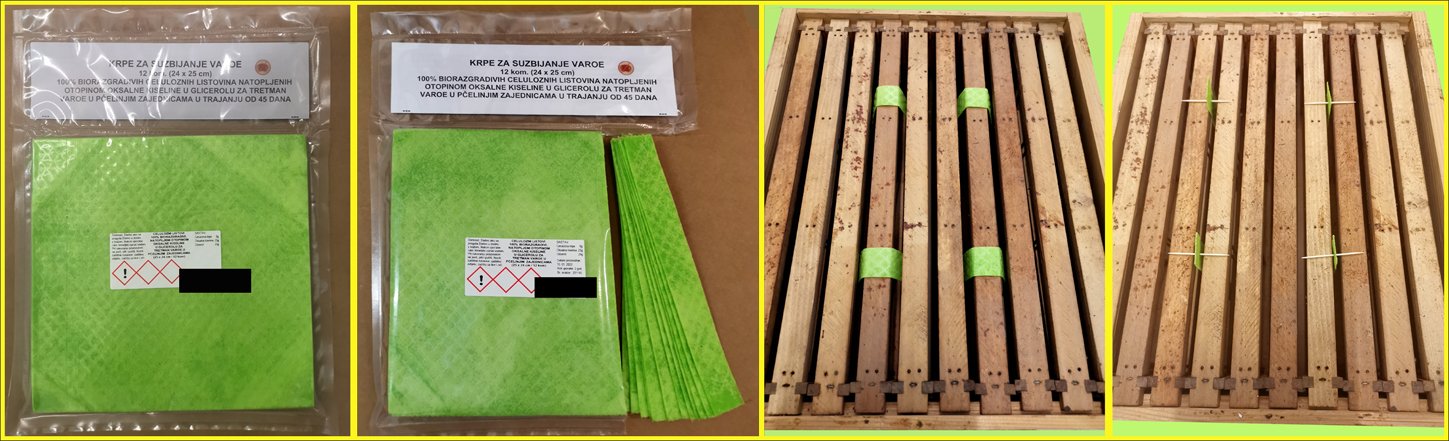 Varocidne krpe (listovi) dimenzija 24 x 25 cm su napravljene od 100% celuloze i imaju veliku moć upijanja. Natopljene otopinom oksalne kiseline sadrže 50g djelatne tvari, što je više nego dostatno za jednoipomjesečni tretman pčelinje zajednice. Koriste se na dva načina: režu u trake širine 3 cm te se (4 trake) prevjese preko satonoše ili se zataknu u ulice plodišta da vise na nosaču. Ako ih pčele nakon 60 dana same ne iznesu (očiste), pčelar ih vadi i odlaže u biootpad (potpuno su biorazgradive). Krpe natopljene oksalnom kiselinom i